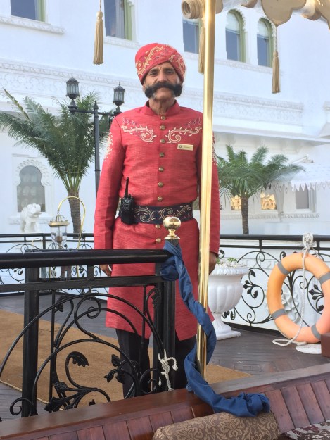 Our greeter at the dock, arriving at the Lake Palace Hotel.