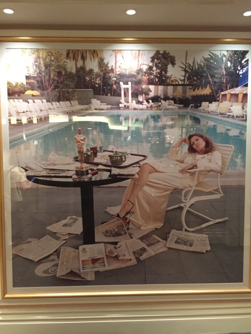 A photograph of actress Faye Dunaway with an Oscar statuette at the Beverly Hills Hotel pool, on a wall inside the hotel (no photographs are permitted to be taken at the pool by the public).