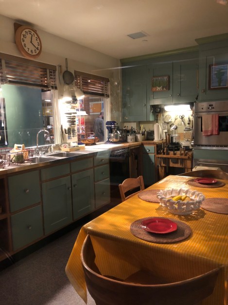 The kitchen was the set for several of Julia Child’s television shows. For taping, the TV crews removed the table in the center of the kitchen and pulled in a center island with stovetops. Visitors to the exhibit peer into the kitchen through several plexiglass panels.