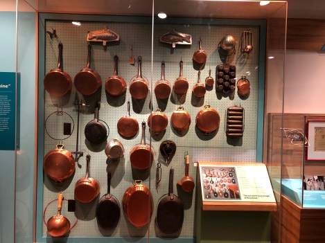 Adjacent to Ms. Child’s kitchen is a display of some of her pots and pans. Most of the copper pots were purchased at the Parisian kitchen store Dehillerin. (I highly recommend a visit to the store even if you only buy a citrus reamer! I purchased a serrated bread knife at Dehillerin, which I treasure.)