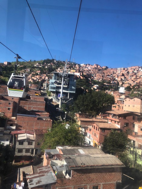The central core of Medellin lies on a sprawling valley floor, at about 4,900 feet altitude, with steep mountain slopes rising up on either side. The mountainsides are covered with barrios, sometimes called “favelas,” or “squatter” communities, where many thousands of low-income residents have built houses, sometimes literally on top of one another. When the government installed a system of cable cars (think gondolas at ski areas), an arduous journey which previously took hours by foot, climbing down and back up stairs and steep pathways, became an easy commute. This opened up access to education, health care, and jobs, on the valley floor below.