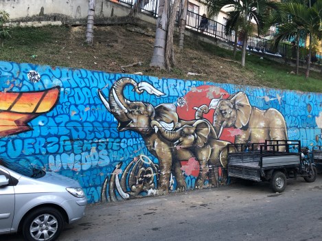 Looking down on some of the homes, Sebastian asked us to note Venezuelan flags. Colombia has been absorbing large numbers of Venezuelan refugees, and some have moved into the communities on the mountainsides of Medellin. It is hard to make them out in the photo below, but they are there. They are similar to the Colombian flag, but have stars within the blue band. Click on this link to read an interesting article in The Atlantic about how Colombia is handling the influx of Venezuelan refugees.