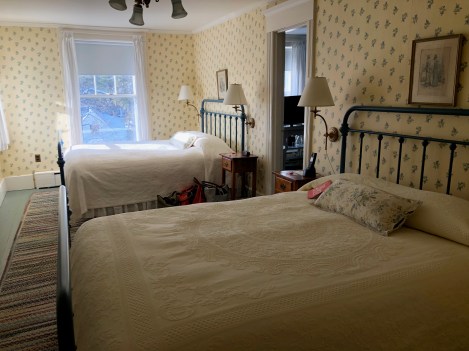 We had a charming room in the main inn, with two double beds and a comfortable, separate sitting room with couch, desk and easy chairs. The rugs are braided, and the walls are wallpapered in homey prints. Our up-to-date bathroom had a shower with glass door and a vintage claw-foot bathtub. Our mid-week rate was about $211 a night plus tax, plus a fee designated for historic preservation purposes. I obtained a discount because I am a member of the National Trust for Historic Preservation and the hotel is affiliated with the Historic Hotels of America.