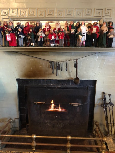 Fireplace in the Red Lion Inn lobby, with the mother lode of Byers’ Choice Carolers on the mantel above.