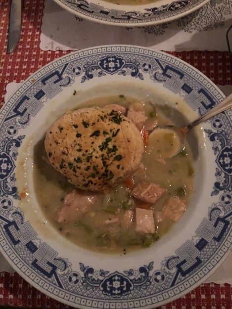 The chicken pot pie was kind of a chicken stew with a puff pastry sitting on top of it.