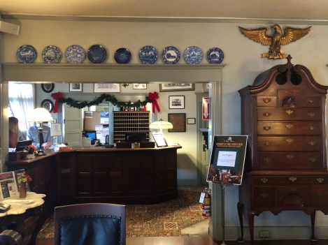 Looking towards the reception desk in the lobby. The highboy, the eagle, and the plates are just a few examples of the antique furnishings that fill the inn.