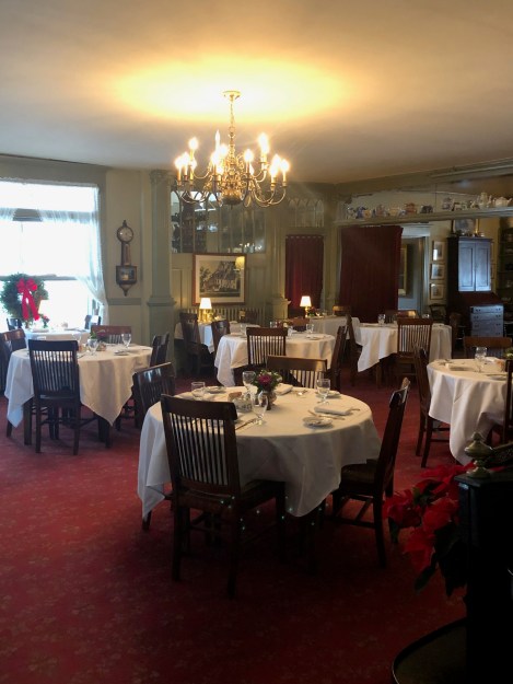 Our main objective in staying at the inn was simply to soak up the atmosphere, enjoy the Christmas decorations, and hang out in the tavern and lobby. We ate dinner and lunch at the inn — in the tavern as well as a light dinner in the pub called The Lion’s Den, that is housed in the basement of the inn. I wasn’t blown away by the food, to be honest, but the historic setting made up for any lack of presentation or innovation. Our breakfasts were in the main dining room. It was fairly predictable fare, but satisfying.