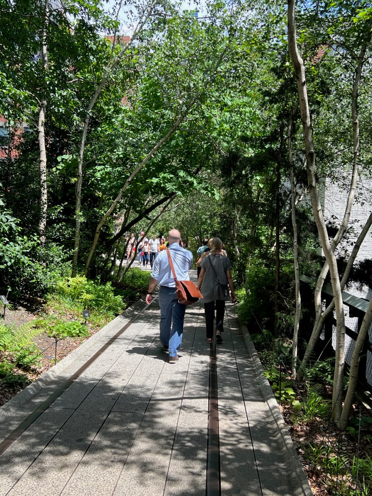 Fortified by our brunch, we headed a few blocks west toward the High Line, the nearly 1 1/2 mile-long linear, elevated park and walking path, created on a former railroad spur. Every time we’ve walked on the path it has been crowded, and this beautiful early June Friday was no exception. But we love the views of the river, the still-in use rail yards at the north end, and the extensive plantings along the path, with many benches for sitting.
