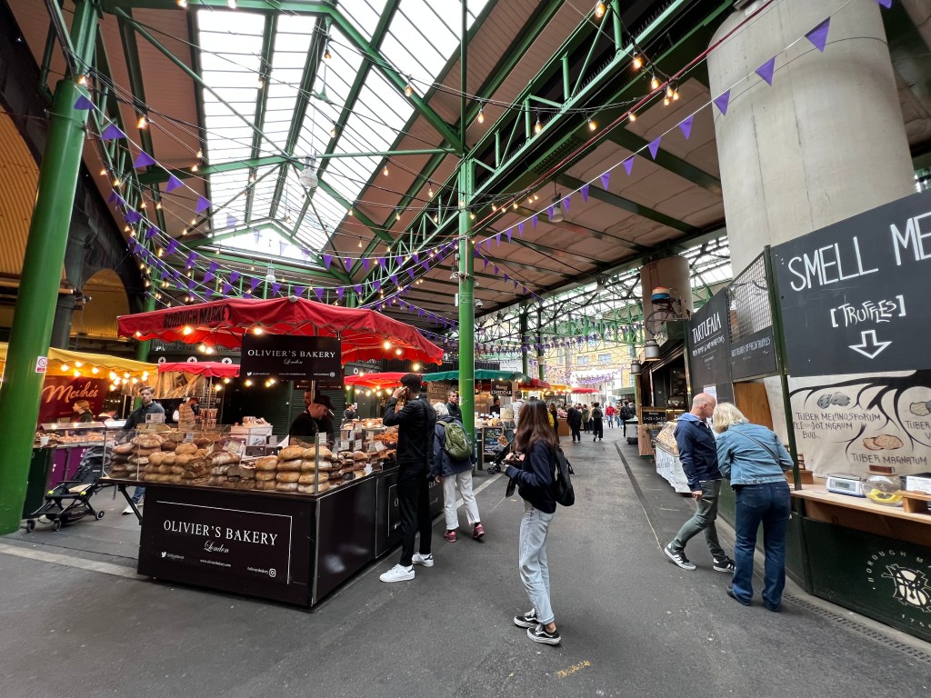 One of the oldest and most famous of London’s food markets, Borough Market, is located on the south side of the Thames, the South Bank, adjacent to Southwark Cathedral. (Note: We were surprised to learn that Southwark is pronounced “suh-thrk”!) William Shakespeare lived and worked in the neighborhood, (the reconstructed Globe Theater is nearby) and it is believed he shopped for food here, since there has been a market on the site since at least the 12th century. It is a lot of fun to wander through the stalls and passageways, and some vendors offer tastings.