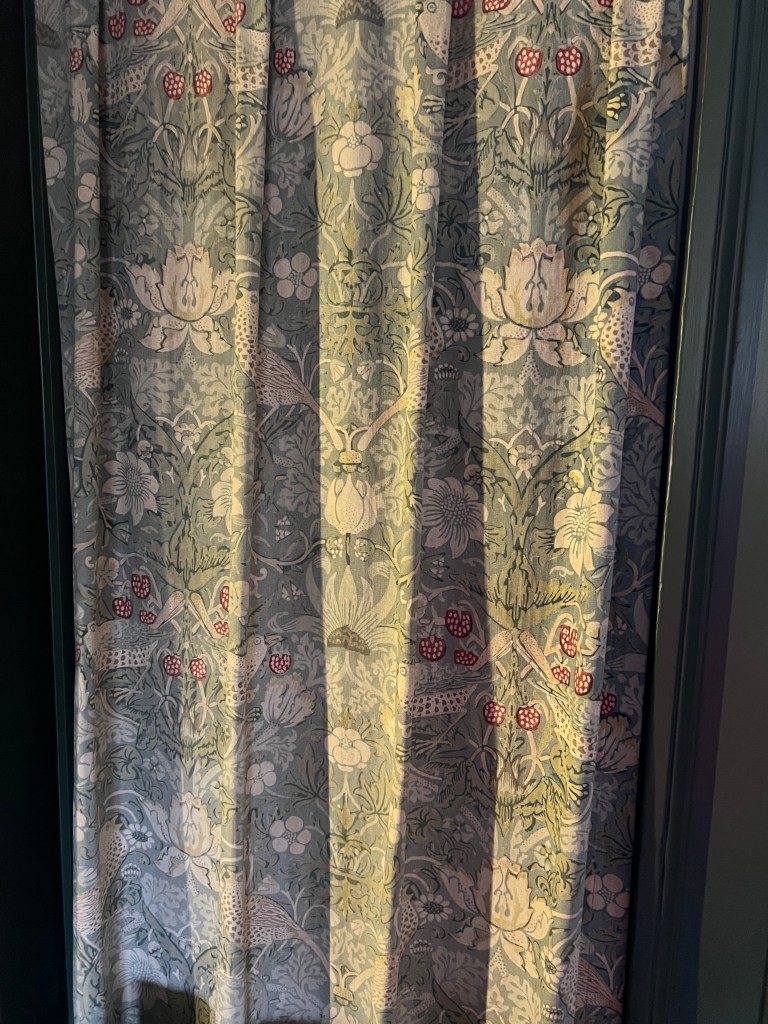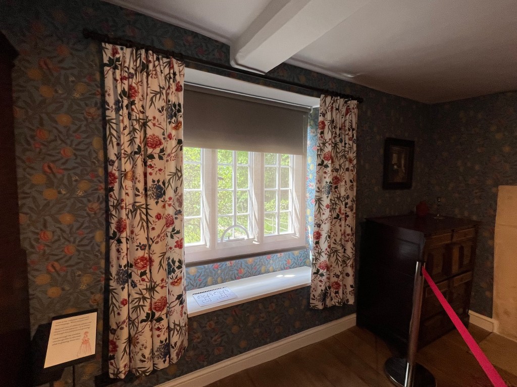 Morris’s bedroom is particularly interesting, with its hand-stitched bed hangings, sewn by Morris’s daughter, May. The poem stitched on the panels, written by Morris from the point of view of the bed, reads: The wind’s on the wold And the night is a-cold. And Thames runs chill Twixt mead and hill. But kind and dear Is the old house here And my heart is warm Midst winter’s harm. Rest then and rest And think of the best Twixt summer and spring When all birds Sing In the town of the tree; And ye lie in me And scarce dare move Lest earth and its love Should fade away Ere the full of the day. I am old and have seen Many things that have been Both grief and peace, And wane and increase, No tale I tell Of ill or well But this I say Night treadeth on day And for worst or best Right good is rest.