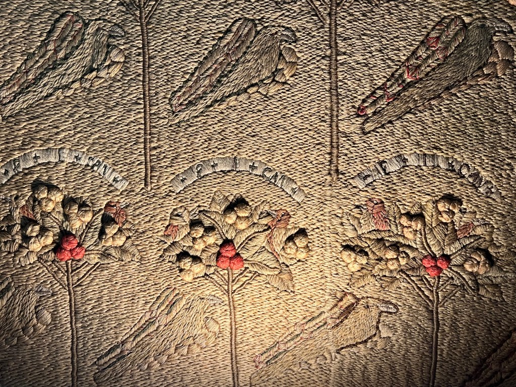 Within the main house, many examples of work done by Morris’s own hand are on display. The original main house, built of Cotswold stone, dates from the 17th century. The tapestry on the left, below, was designed and worked by Morris in 1879. He had a loom installed in his bedroom at Kelmscott and recorded that it took him 516 hours to complete. He called this as both “ancanthus and vine” and “cabbage and vine.”