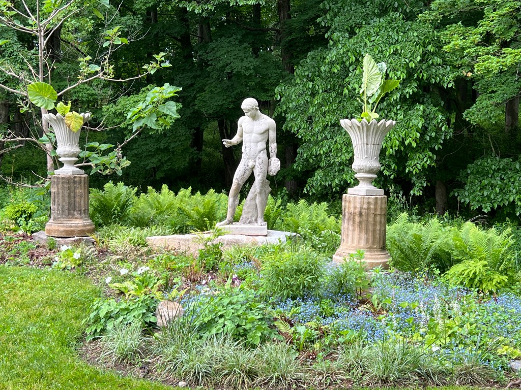 Perennials and statue near Clove Brook; a faux bois basket of succulents; view from one of the perennial gardens to rear of main house.