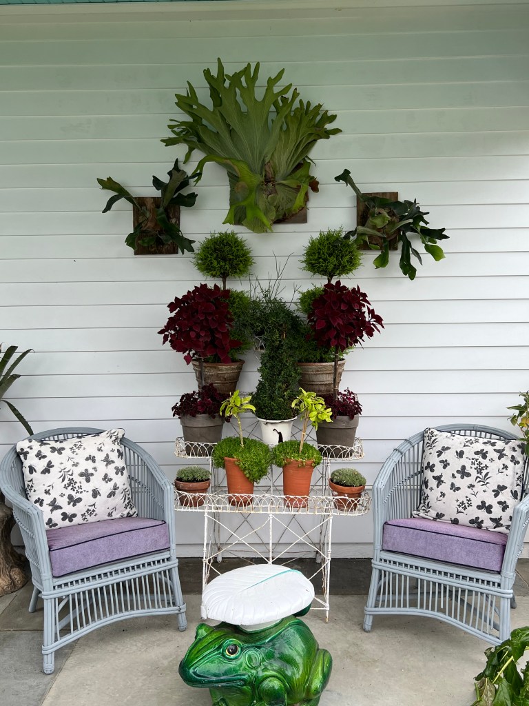 A cozy covered sitting area with unusual varieties of plants hung on the wall.