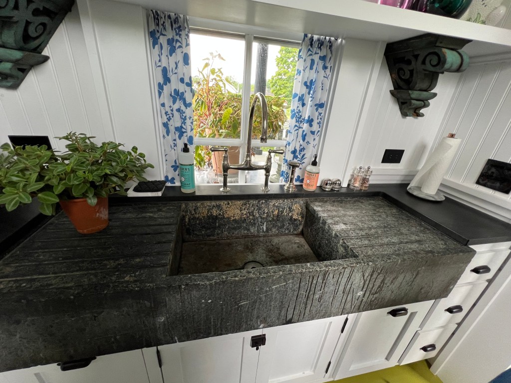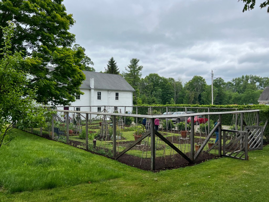 The vegetable garden is sensibly fenced to protect it from deer. The building to the rear is the ceramics studio. The door was open, and we peeked inside. I’m wondering if those glazed pieces on the rack are pet bowls!