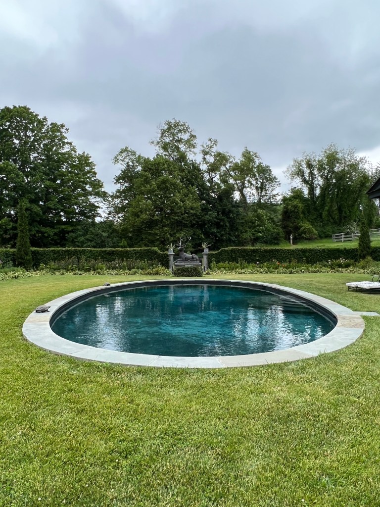 Say what? This neoclassical temple adorned with antlers shed from fallow deer is, indeed, the pool house. The temple faces the pool, below.