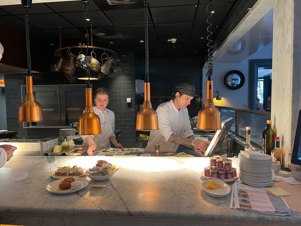 Finally, back to the Pulitzer Hotel, we had a nice dinner at Jansz, including rack of lamb and sea bream. Beautiful interior, with open kitchen. (Note the oblong bitterballen on the kitchen counter ready to be served.)