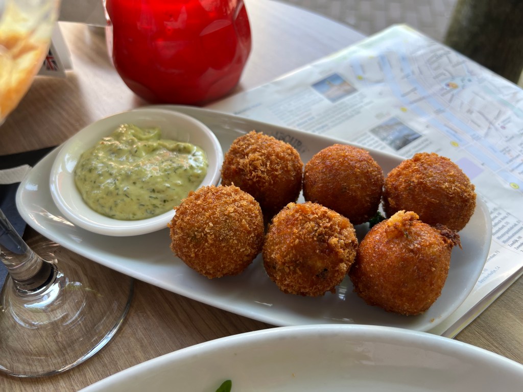 We had some nice meals; several outdoors. I can recommend the Café Luxembourg, at 24 Spui. We had a popular Dutch snack called croquette balls, (or bitterballen if shaped more oblong), with a green herb mayonnaise, an open-faced smoked salmon sandwich, a refreshing gin and tonic, and a local ale.