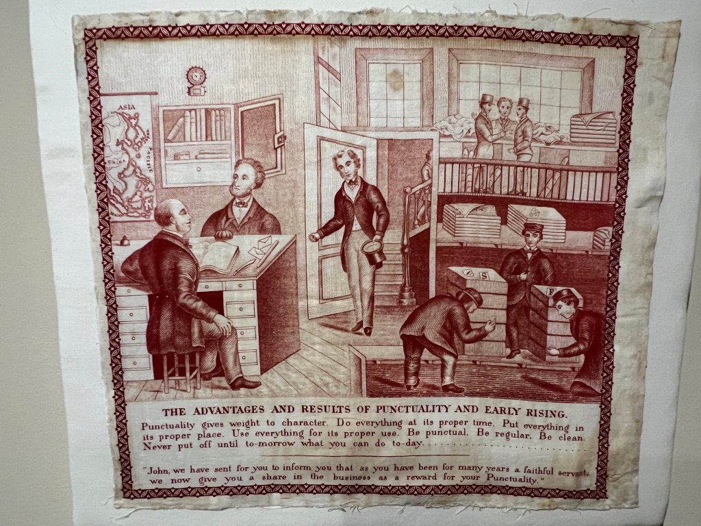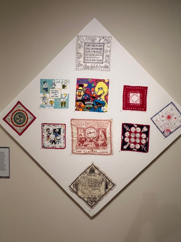 There’s a delightful exhibit on display until the closure of the museum for the fall on October 22. Called “Right Under Your Nose,” it’s a display of children’s printed handkerchiefs. These little pieces of cloth taught children lessons and reinforced cultural standards. They were still being printed until fairly recently (see the Sesame Street example). Here are some photos, below: