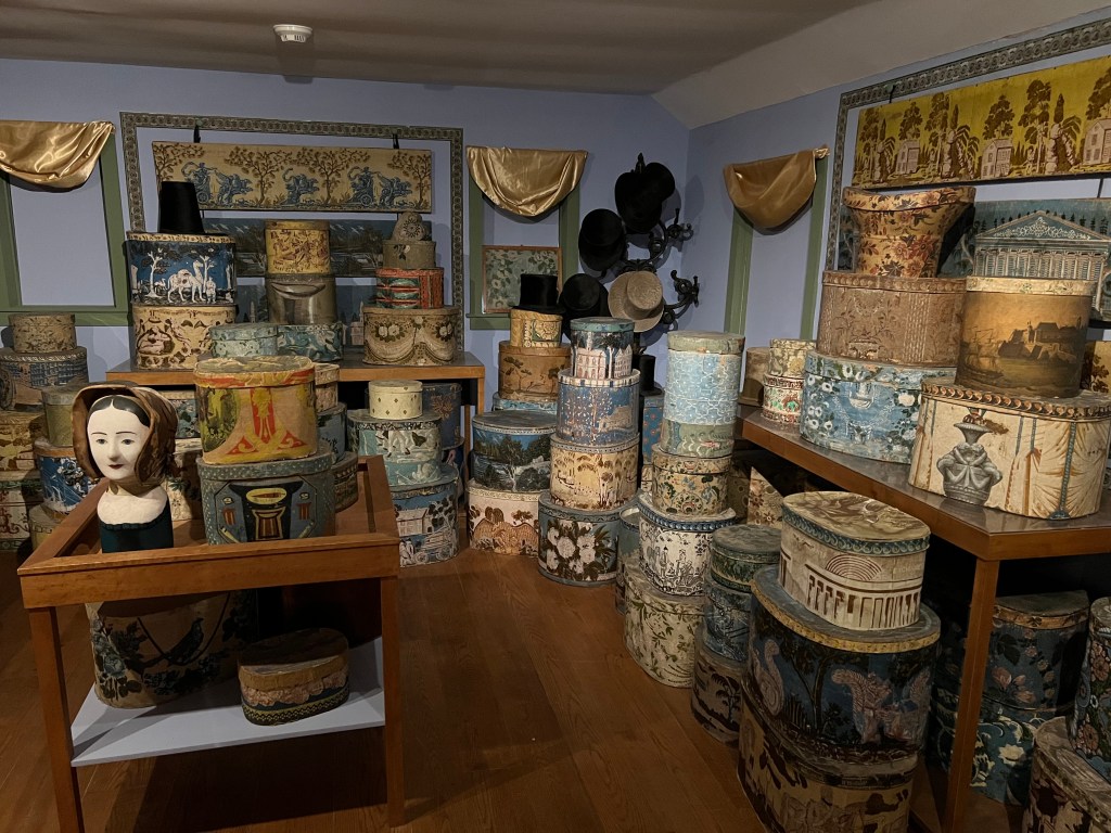 Also in the the Hat and Fragrance Building is a large display of bandboxes, collected by Mrs. Webb. These functioned as both lightweight luggage and stackable storage containers. Made of pasteboard or bentwood, they were covered in decorative printed papers. They were especially popular from 1825 to 1850 in America because of the increasing travel made possible by new modes of transportation (eg., steam locomotives).