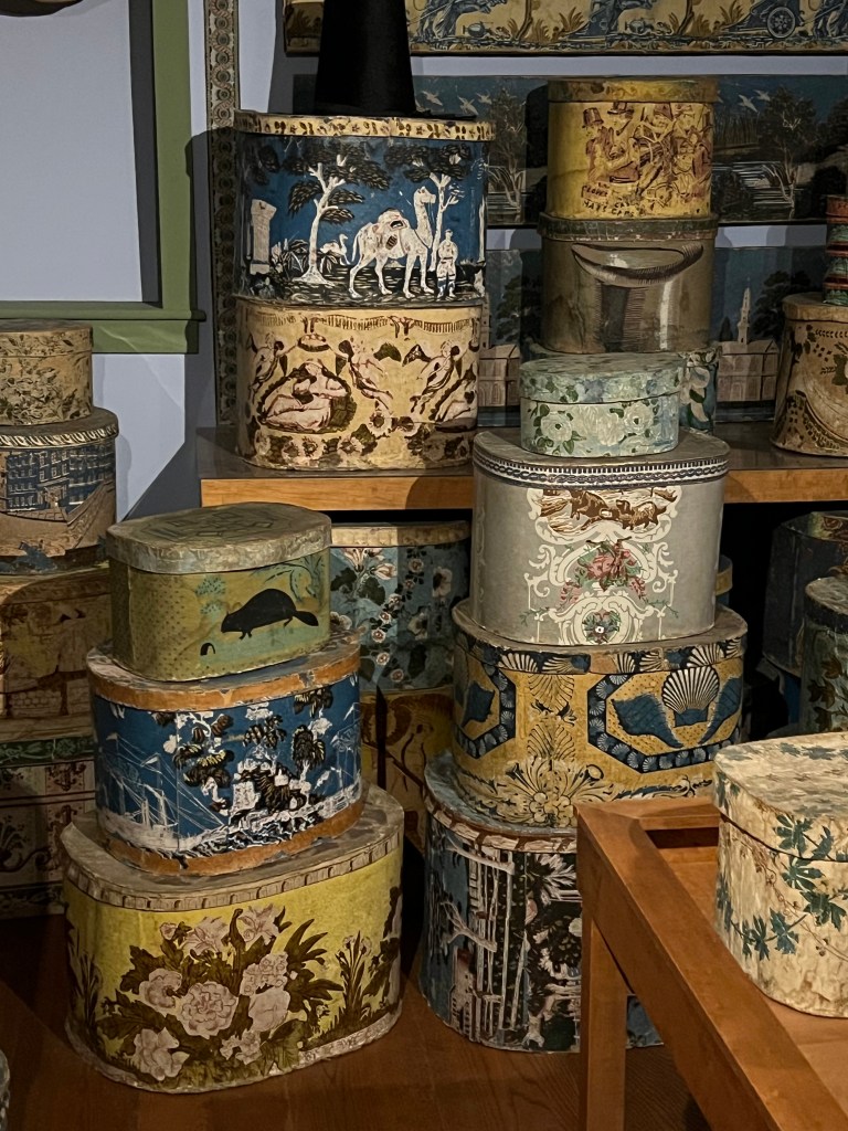 Mrs. Webb even had the walls of a bedroom at her Westbury, Long Island home lined with paneling made with unfurled bandbox panels and detached lid tops. Some of the panels are on display in this exhibit.