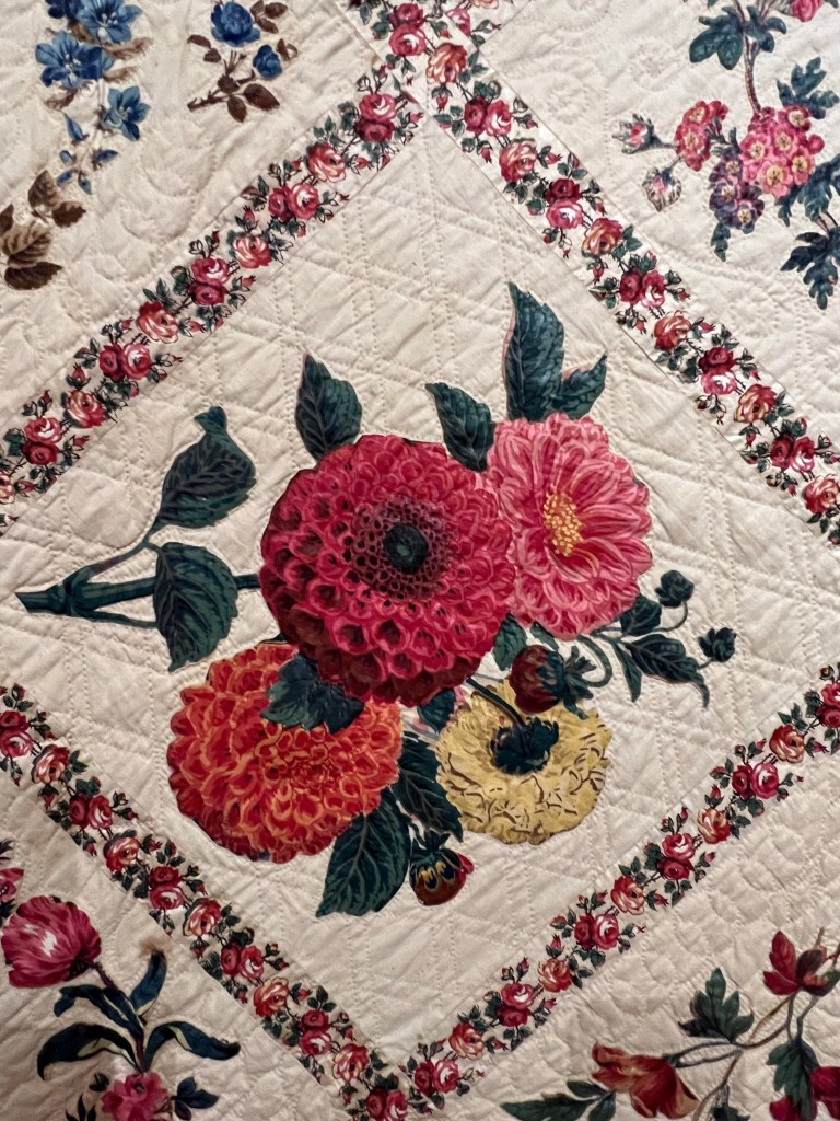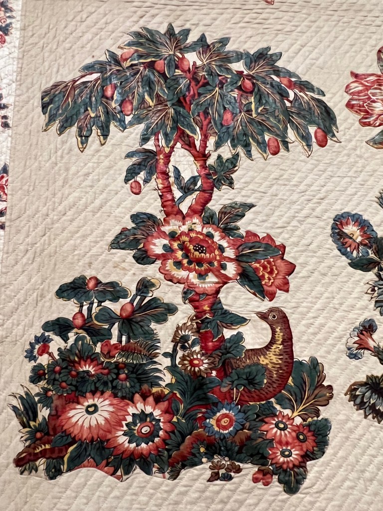 These three bedcovers are known as “broderie purse” quilts, basically meaning “Persian embroidery.” The technique became popular in the US during the mid-19th century when consumers could purchase colorful, patterned cottons. Images of flora and fauna were cut from printed fabrics and appliquéd to the quilt top.