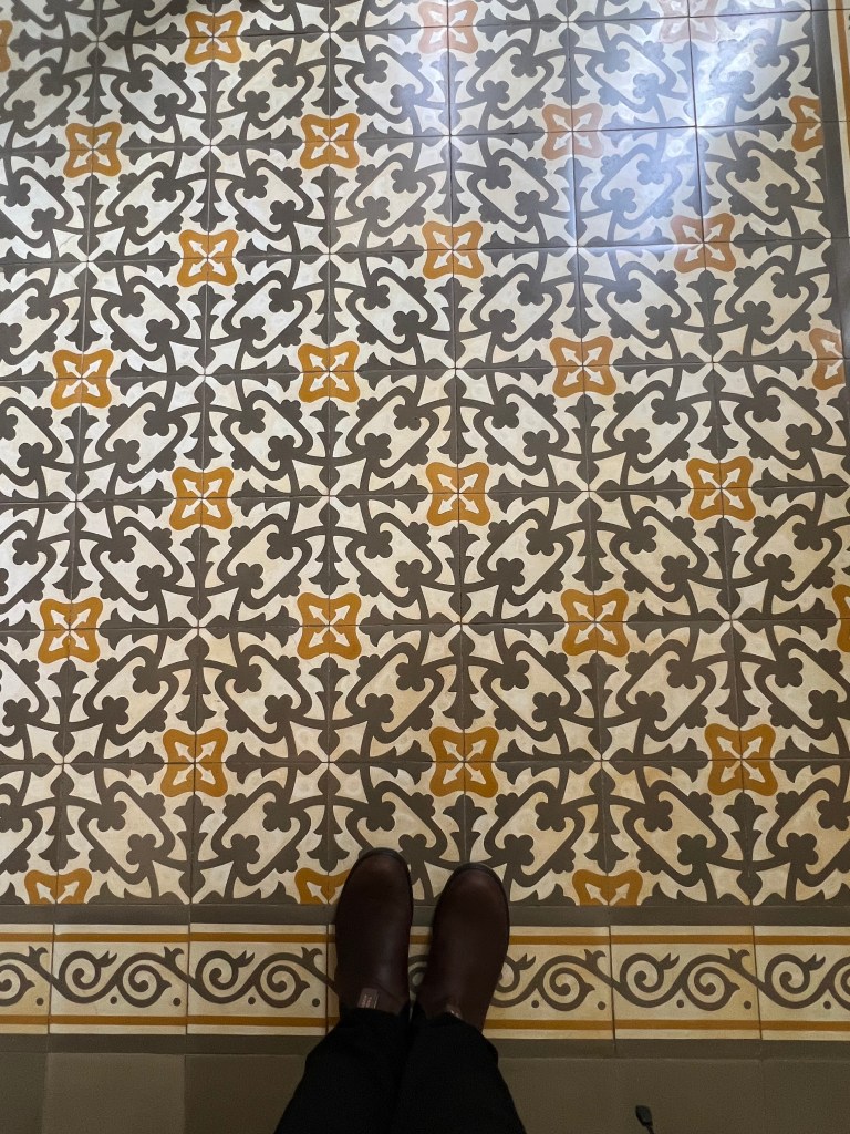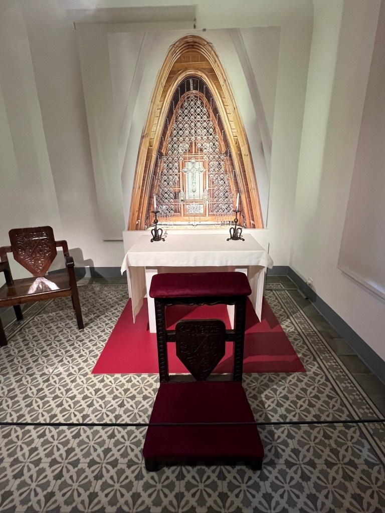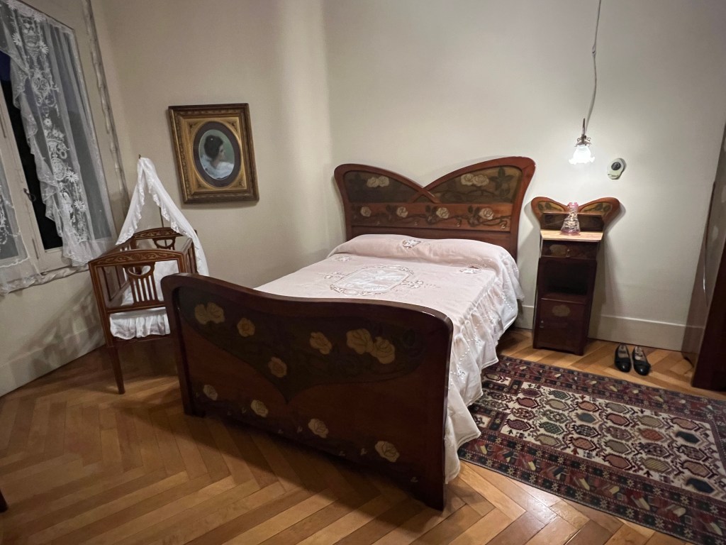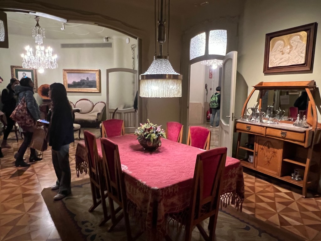 The home is furnished and includes displays of furniture designed by Gaudi. The floors are beautiful mosaic tile, and the visitor views Gaudi’s bedroom and chapel.