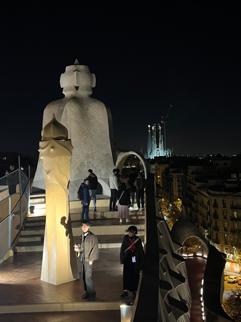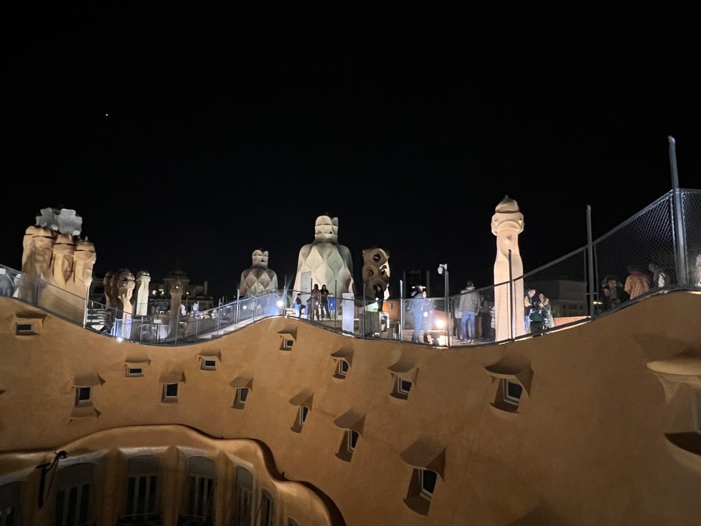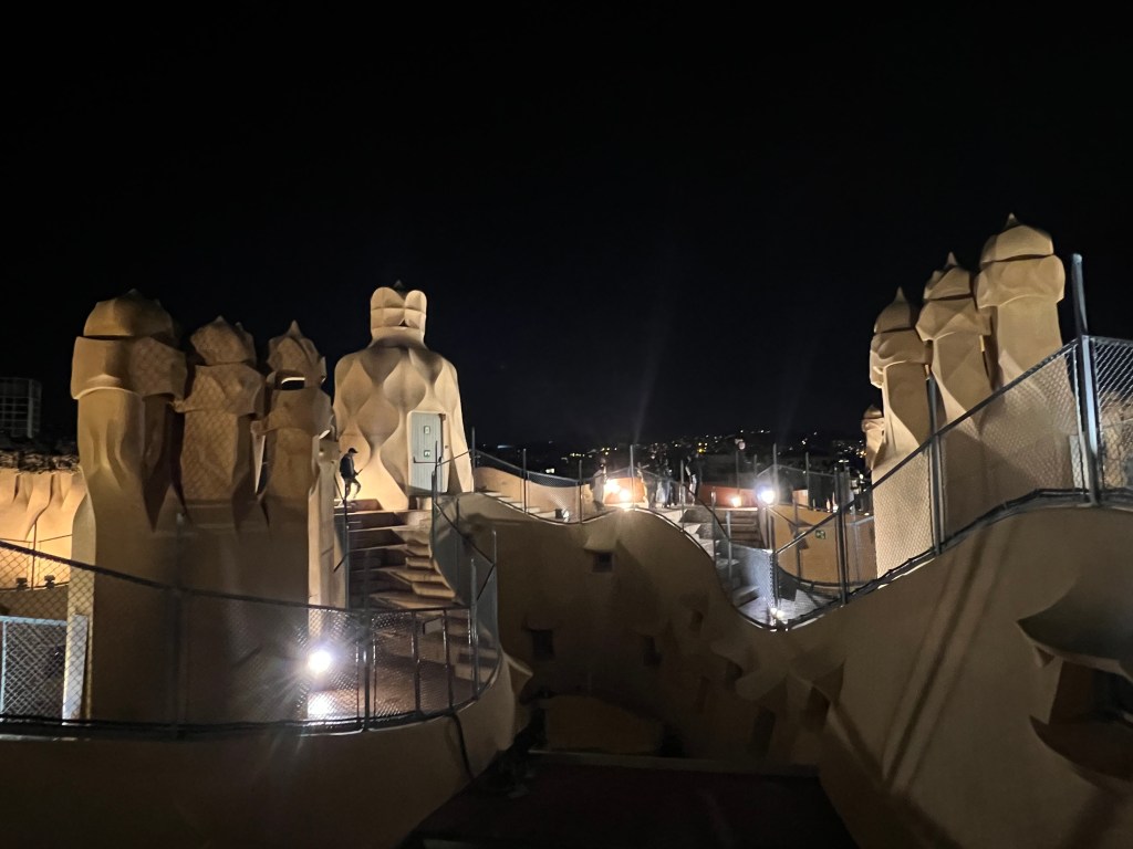 The roof itself, for many, is the real attraction. twenty-eight chimneys and vents resemble people, or warriors, as one poet described them. We were there at night and wandered around the uneven walkway and steps, marveling at the illuminated figures. In the far distance we could see the Sagrada Familia, lit up.