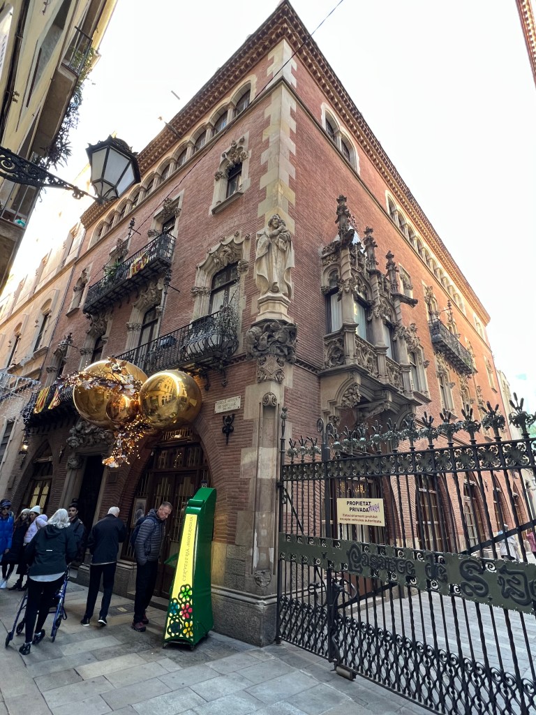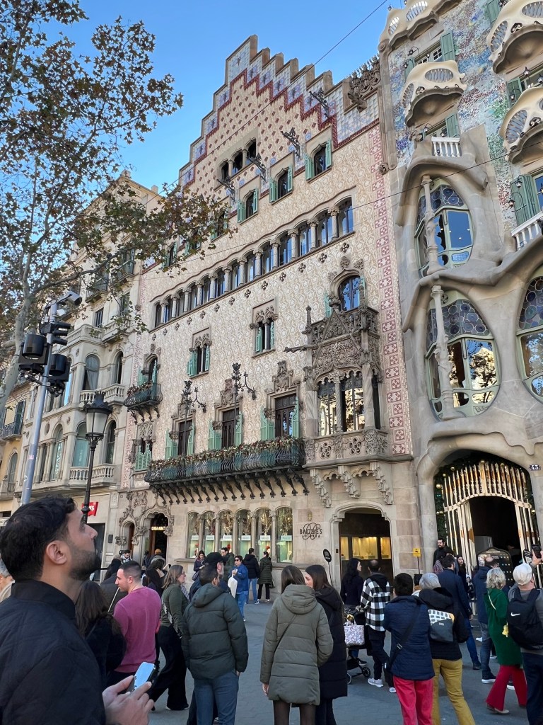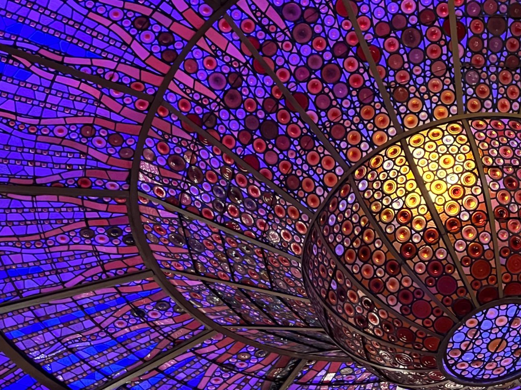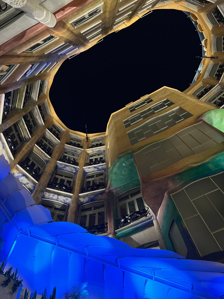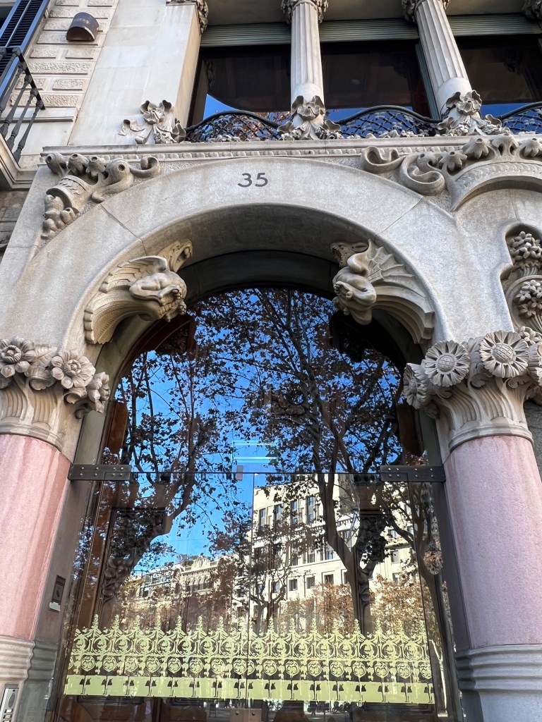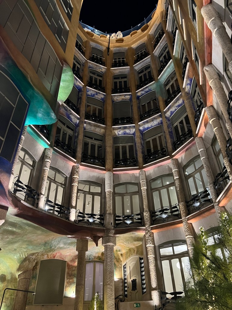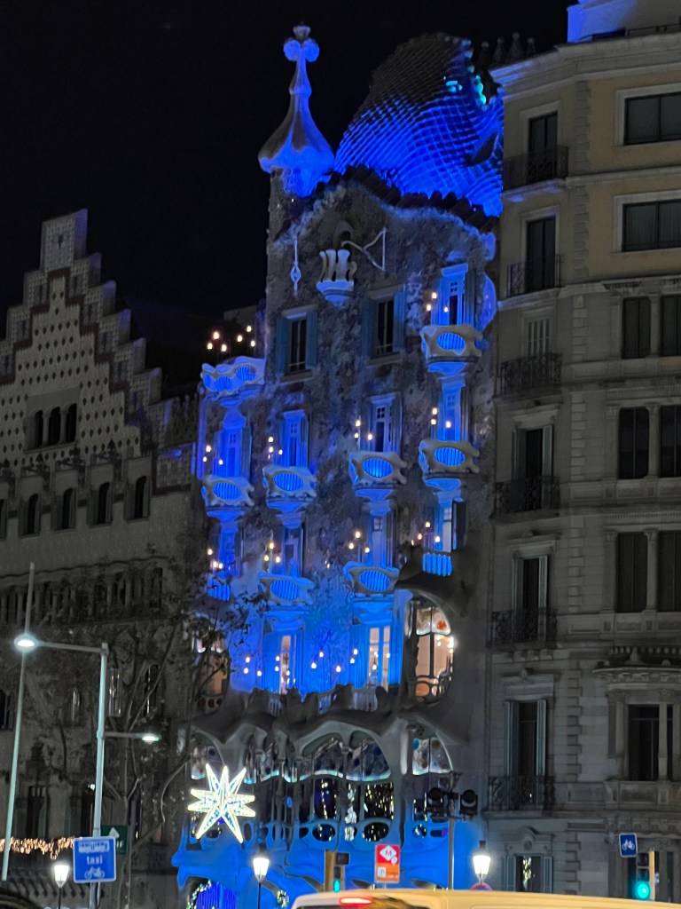 Not far from La Pedrera is the so-called Block of Discord, on Passeig de Gracia, with four adjacent buildings by Barcelona’s most famous modernist architects. We had not purchased tickets ahead and were not able to tour any of the buildings, but we were able to step into the entry courtyard of Casa Amatller. The most fanciful and perhaps well-known of the buildings is Casa Battlo, by Gaudi. The curvilinear facade is fairy-tale like, and at night, the exterior is lighted with various colors.