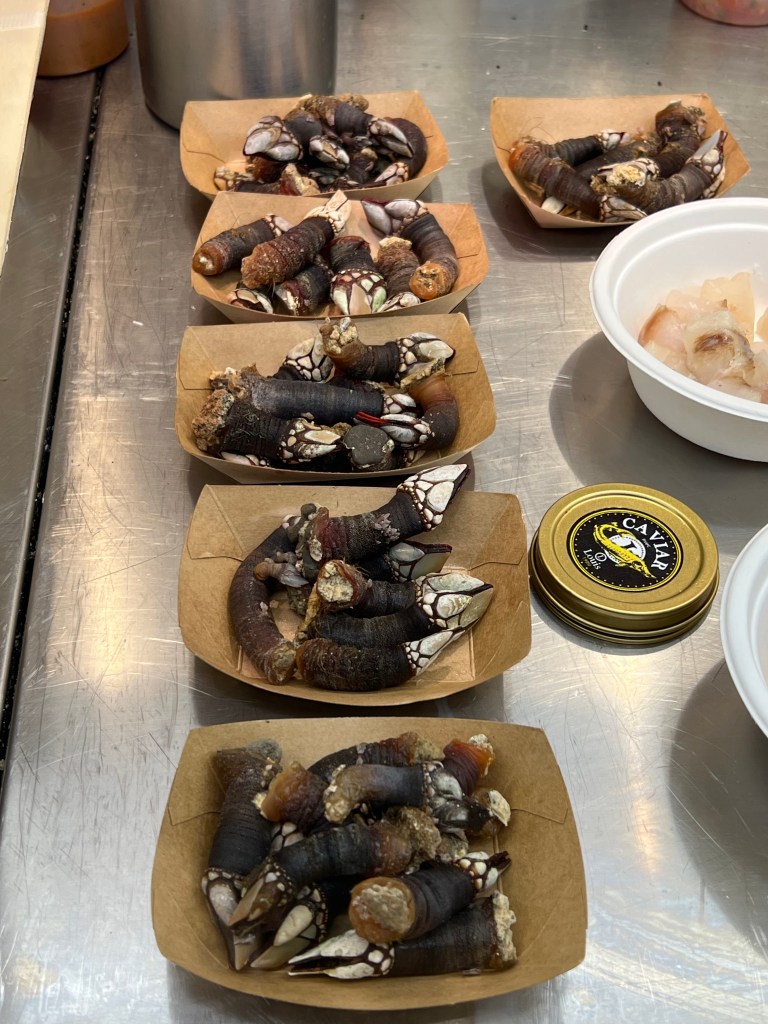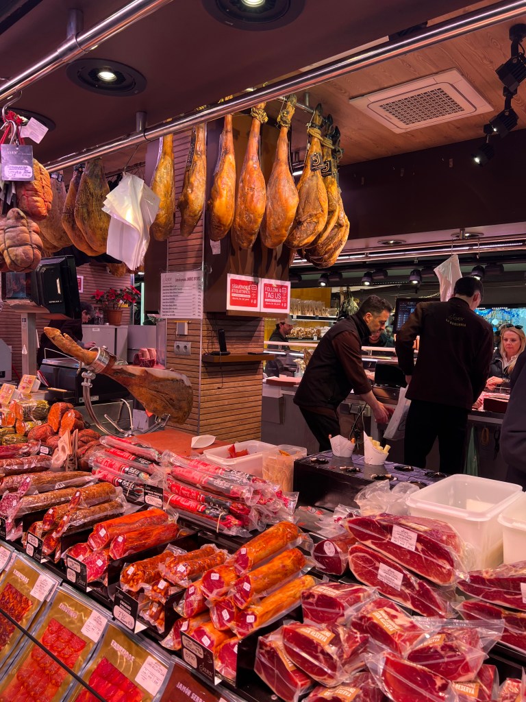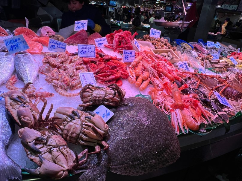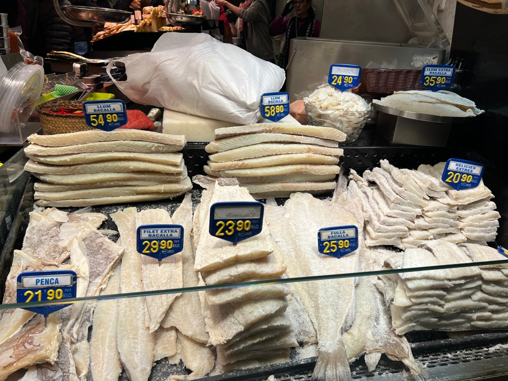 Despite it being overly crowded, I do recommend checking out La Boqueria, which is probably Barcelona’s most famous food market. Even if you don’t buy anything to eat, it’s fun to check out all the stands with fresh seafood (including barnacles and dried and salted cod – here called bacalla — that we first had in Portugal), Iberian ham and cured meats, and olives.