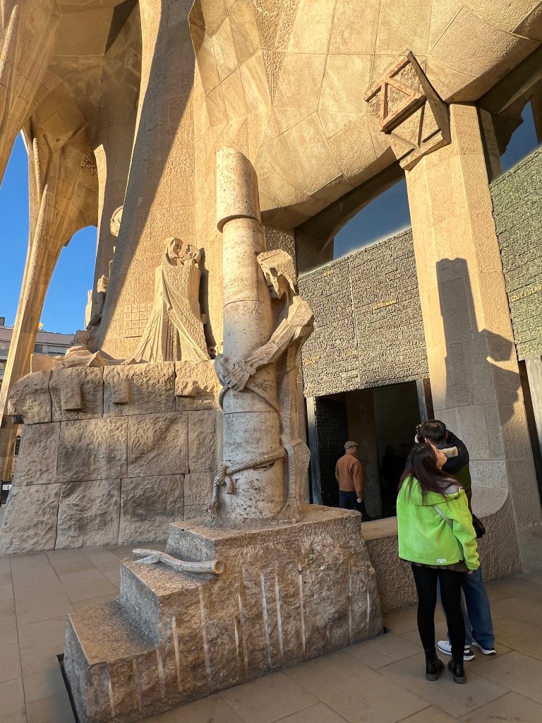 The Passion facade is of a highly different style than the Nativity. the sculptures are more abstract and angular. They depict such things as Judas hugging Christ before his betrayal, and the flagellation of Jesus.