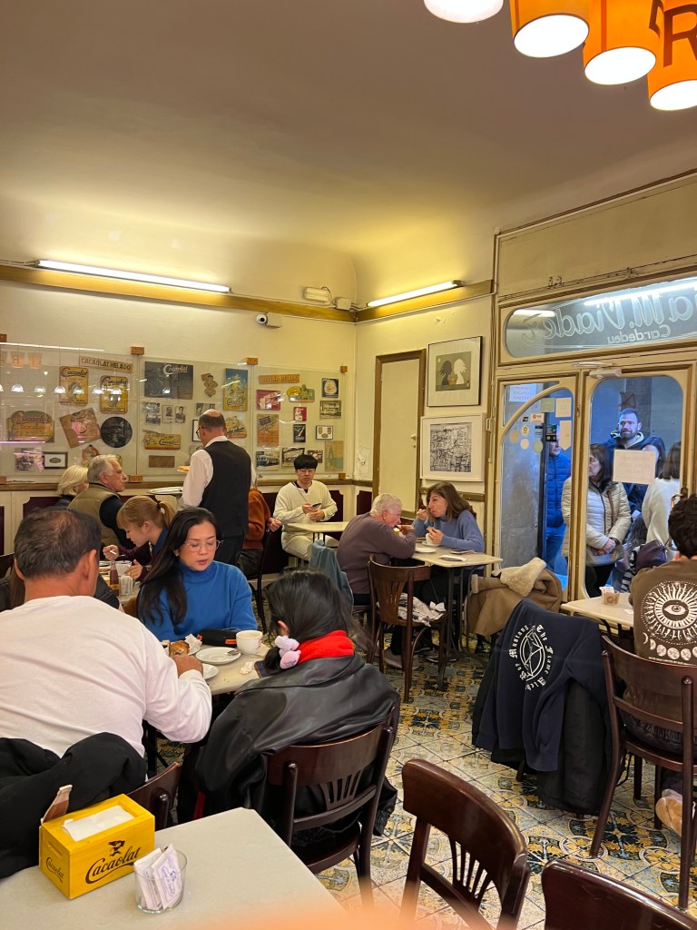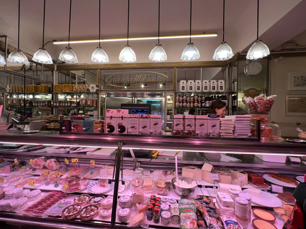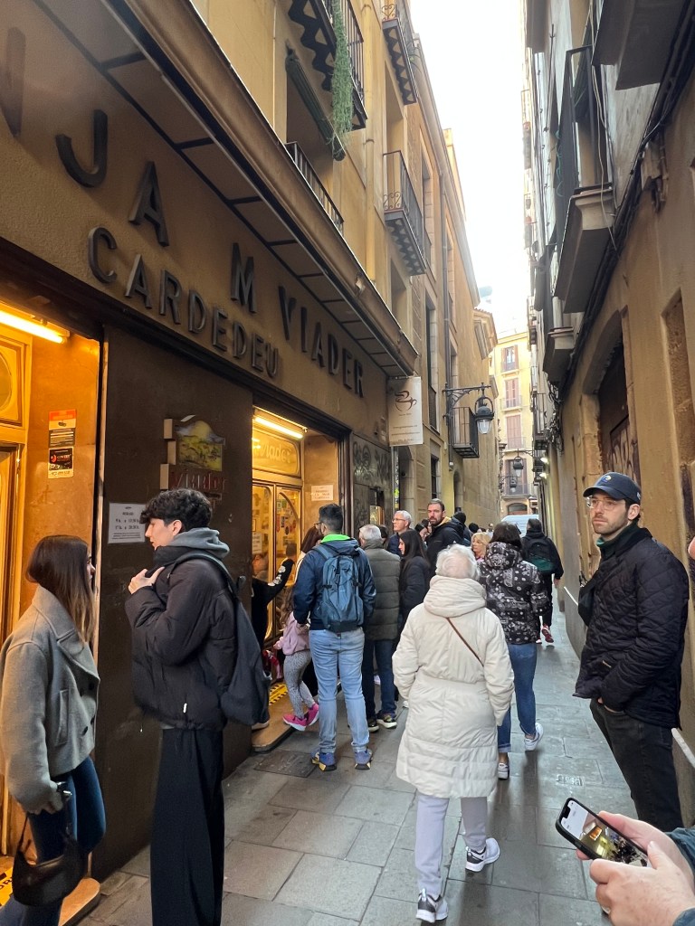 Not far from La Boqueria is what is called a granja — a cafe specializing in dairy products. At the urging of one of our family members, we stopped at the famous Granja M. Viader for hot churros con chocolate. There was a long line to sit inside so we got our treats “to go,” and found a place to sit outside and enjoy. You dip your churro into what is called hot chocolate, but is like a thick chocolate dip — kind of like liquid fudge. What can I say? Hit the spot.