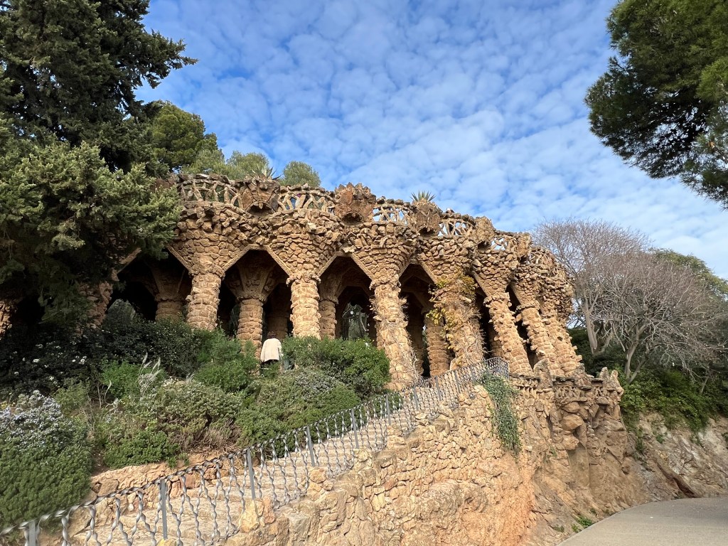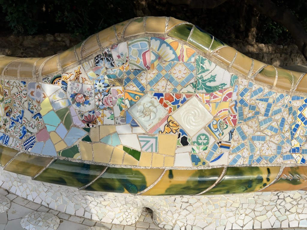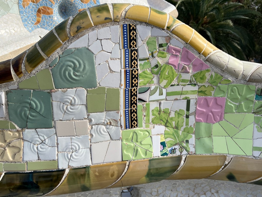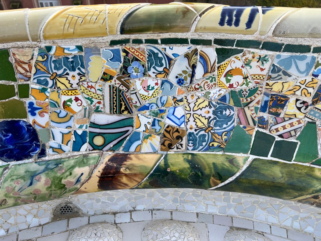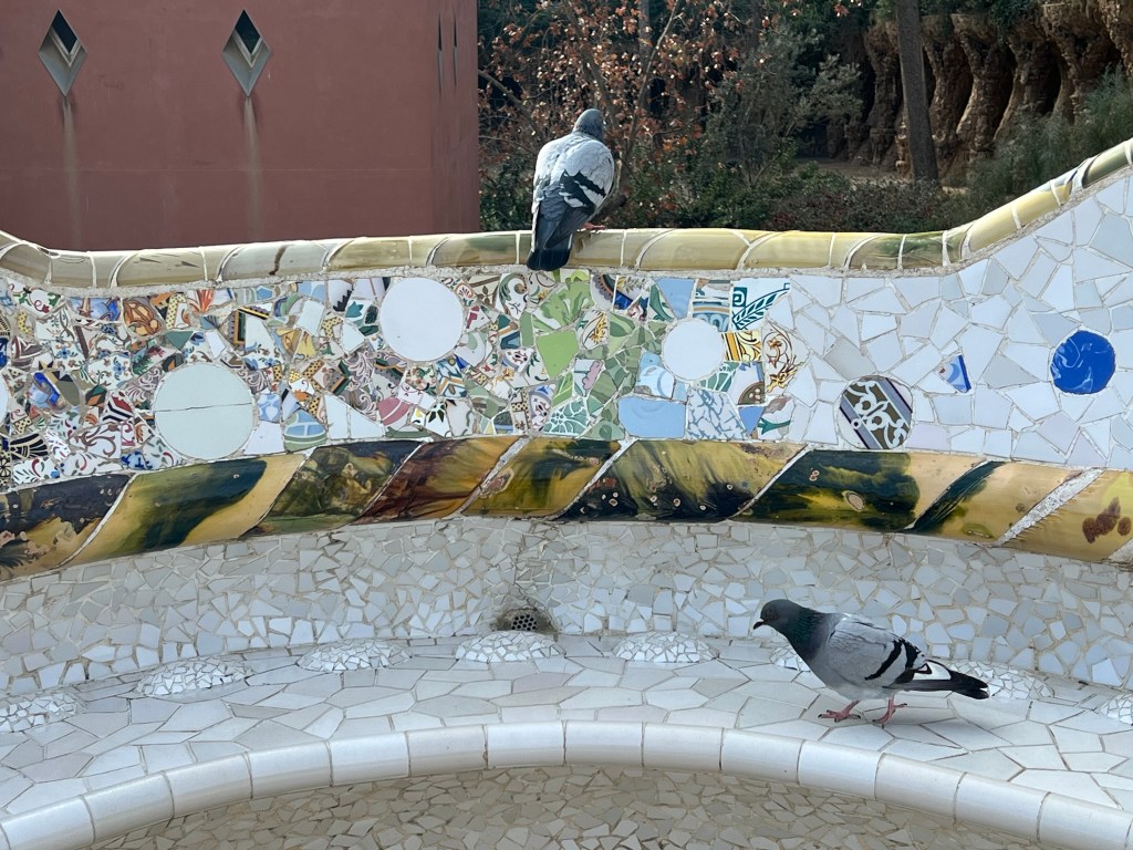 Within the park, which is built on a fairly steep hillside, are unique architectural features like colonnaded footpaths and structures called “viaducts.” There’s also a large terrace with great views of Barcelona. One of my favorite features is the serpentine seating benches covered in broken tiles and ceramic pieces. There are also two charming “gatehouses” that flank the main entrance.
