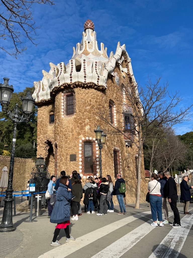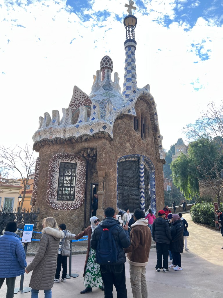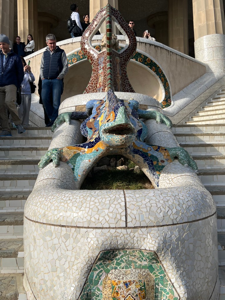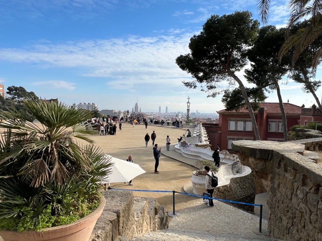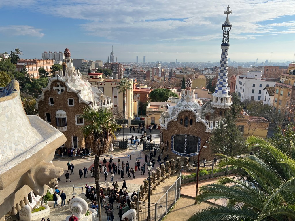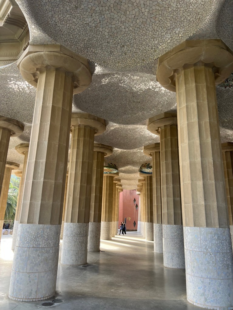 Within the park, which is built on a fairly steep hillside, are unique architectural features like colonnaded footpaths and structures called “viaducts.” There’s also a large terrace with great views of Barcelona. One of my favorite features is the serpentine seating benches covered in broken tiles and ceramic pieces. There are also two charming “gatehouses” that flank the main entrance.
