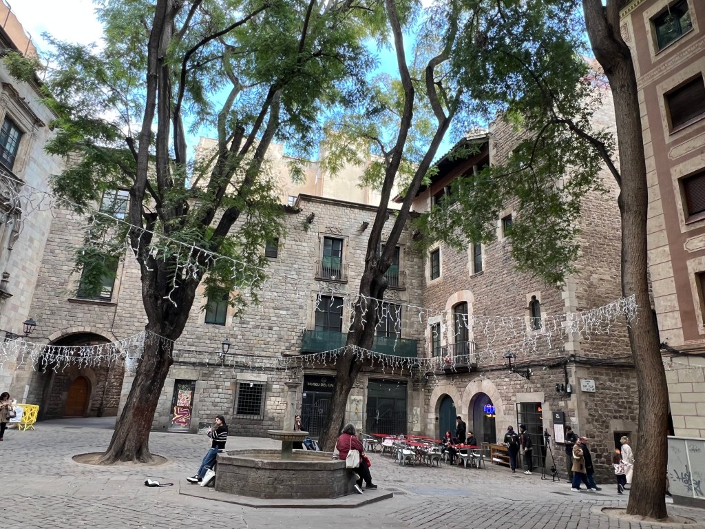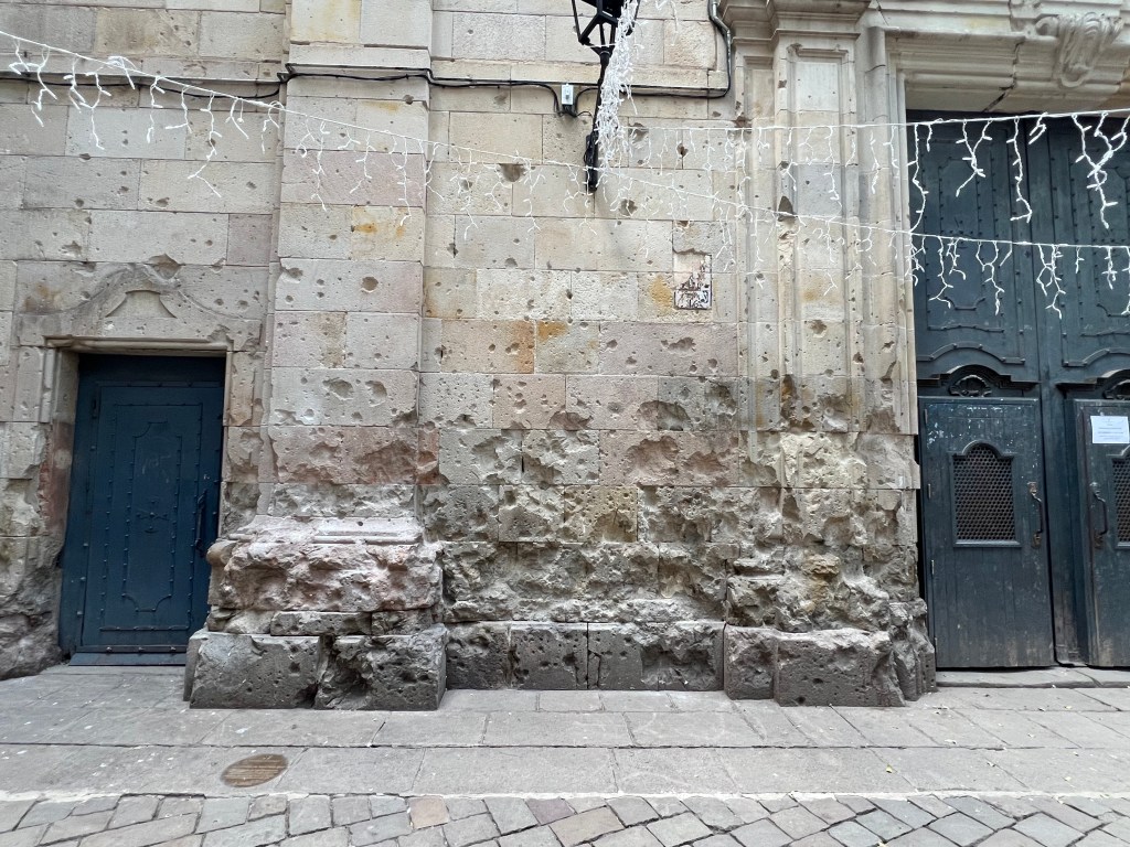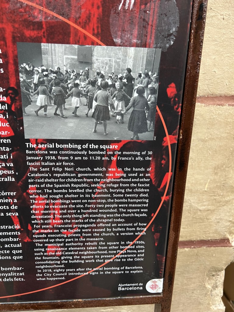 The day my husband and I ended up wandering around the Gothic Quarter — the oldest part of Barcelona — was New Year’s Day, and many sites were closed (like the Cathedral). We stumbled upon one particularly evocative square, with a woman playing a flute, with the somewhat mournful music echoing within the fairly enclosed space surrounded by stone buildings. Turns out, upon reading signage, we discovered that we were looking at the Sant Felip Neri Church, which was held by the Catalonian government and was bombed in January 1938 by Franco’s ally, the fascist Italian air force.The church was serving as a shelter for children and 42 people were killed, including approximately 20 children. The church’s facade shows damage from the bombing.