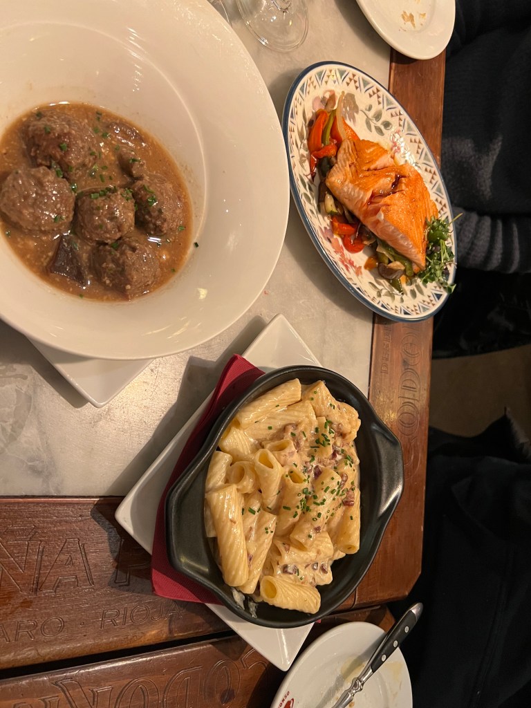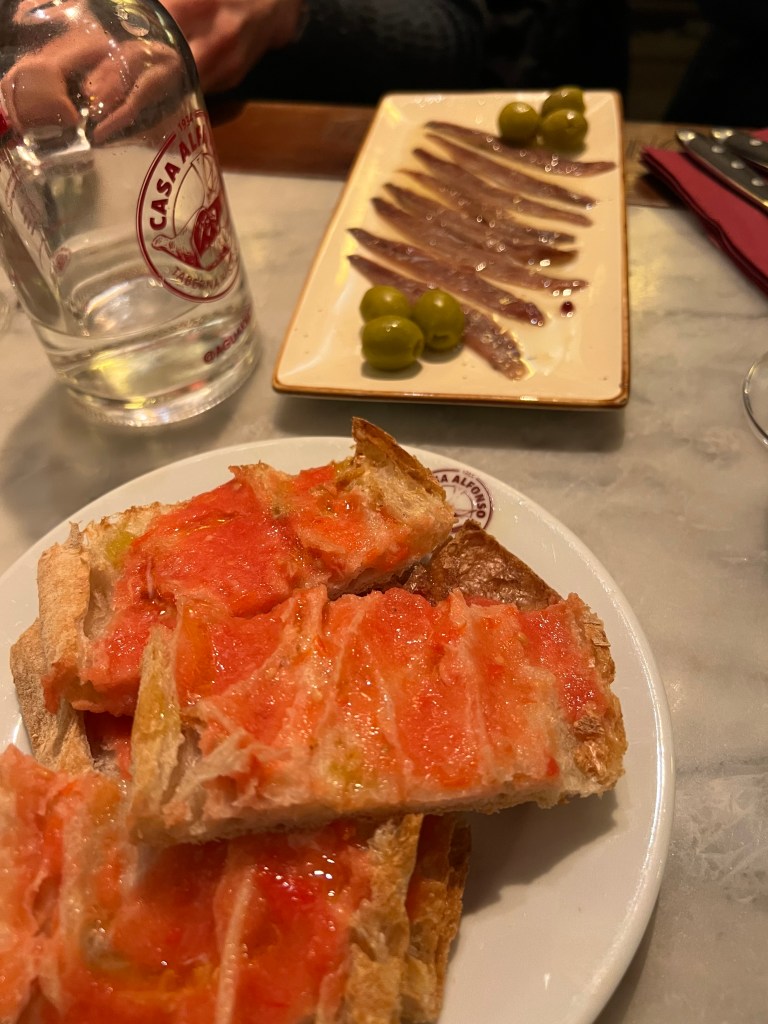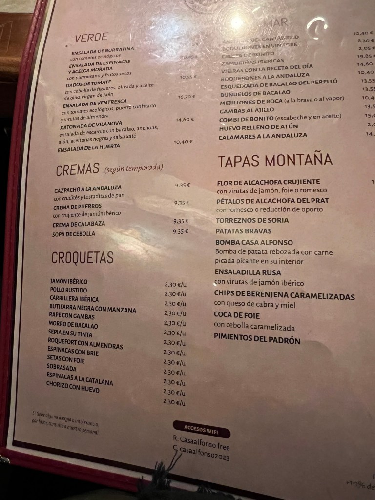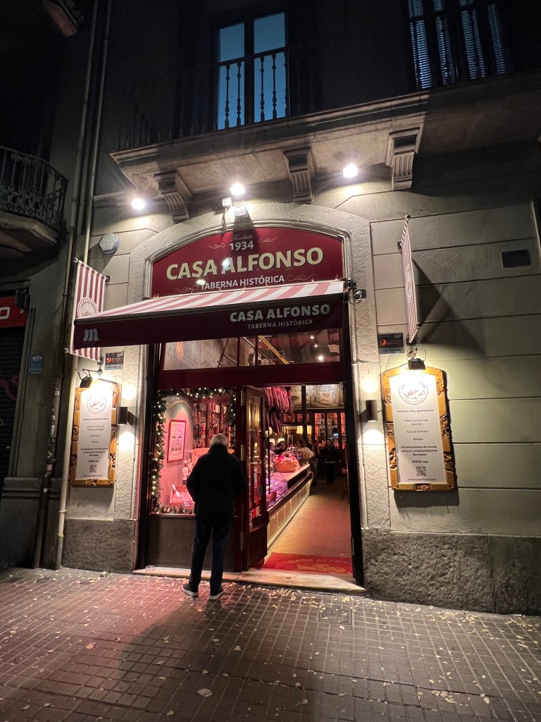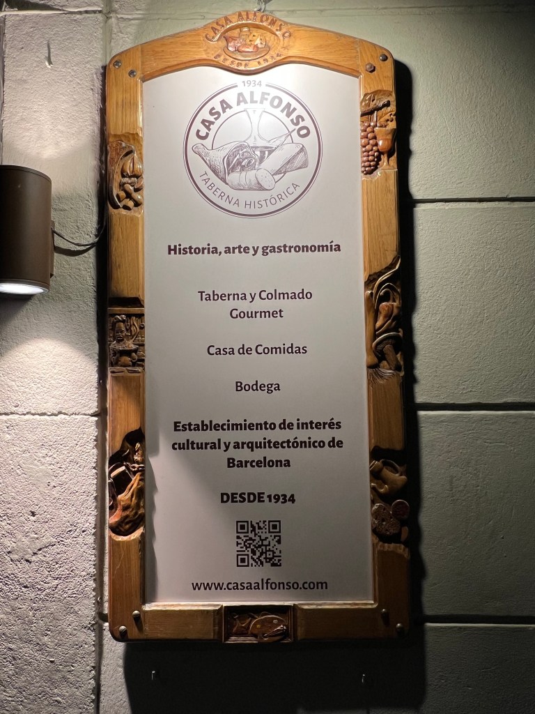 I’m a fairly early-to-bed, early-to-rise person, so the Spanish schedule of eating dinner late (typically after 8:00 pm), doesn’t quite sit well with me. We found that many restaurants don’t open for dinner until at least 7:30 pm. We tried a different restaurant each night, and our favorite was probably Casa Alfonso, opened in 1934, in the Eixample neighborhood, not far from our apartment. I’m not sure if we like it so much because it was our first true tapas experience, or because of the house wine, anticipating the meal during the long wait outside, or our Ecuadorian waiter.