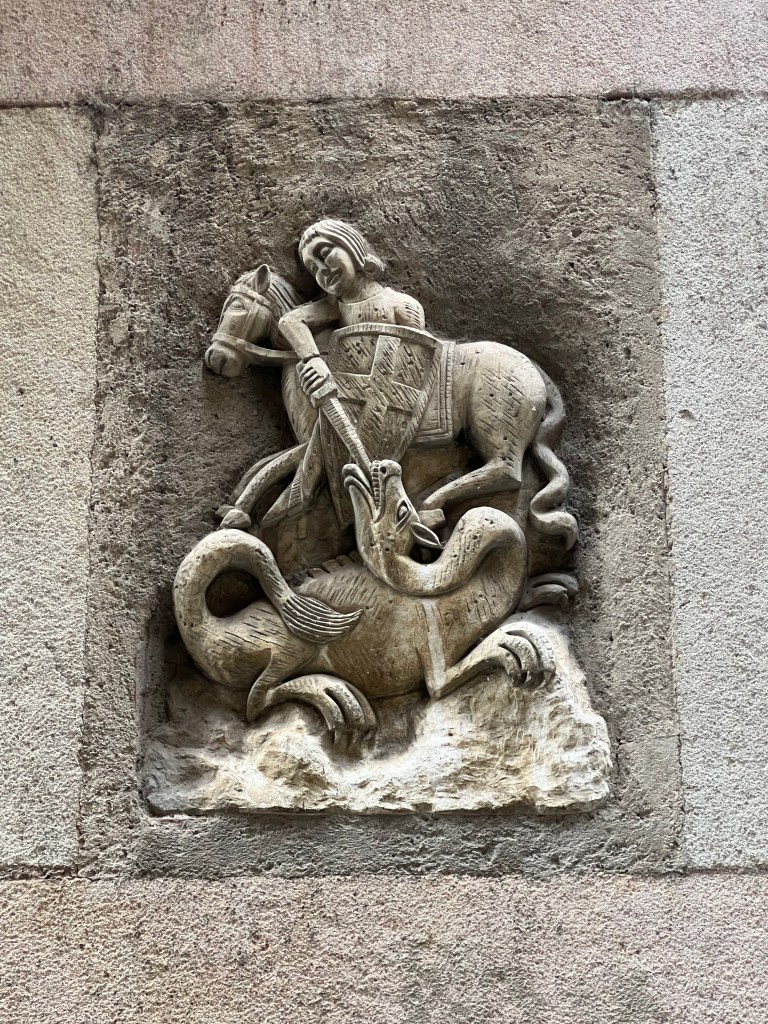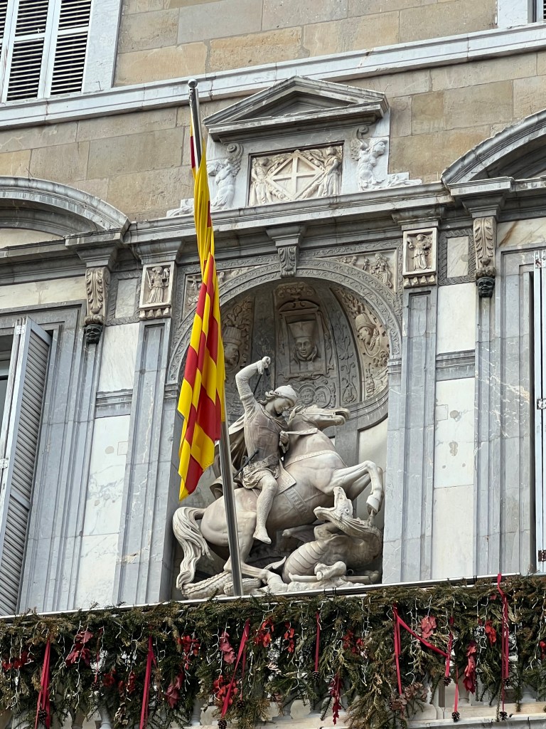 The patron saint of Catalan is Sant Jordi, also known as Saint George. (George is the patron saint of a number of European countries, including England.) There are many depictions of George, typically showing him slaying the dragon, throughout Barcelona. Here are just a few (the flag in the one photo is the official Catalan flag, displayed at the Palau Catalan government headquarters).